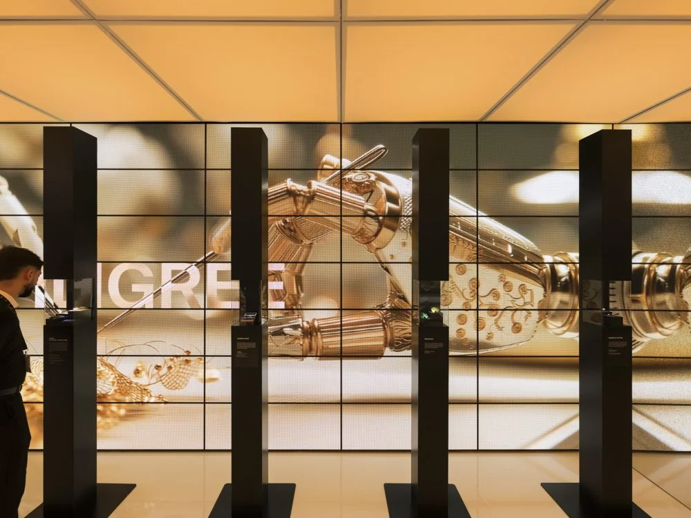 The Atelier is an immersive installation exploring the language of jewelry craftsmanship across time. Seven columns structure the space, each dedicated to a distinct technique, from ancient stone engraving to micromosaic and filigree, enamel, plique a jour, lacquer and inlay, new metals and invisible stone setting.